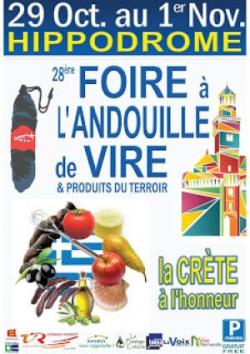 19h30 : dîner spectacle à la Salle du Vaudeville (centre-ville de Vire) avec le groupe musical folklorique crétois et ses danseurs(ses). 30€ avec apéritif et café. Sur réservation au Manoir de la Pommeraie : 02 31 68 07 71 (Menu détaillé dans la rubrique "Menus pendant la foire")