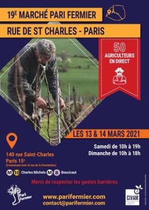 Pari Fermier rue Saint-Charles les 13 et 14 mars 2021, c’est un marché unique en France, des producteurs fermiers en direct et partisans des circuits courts, des métiers à découvrir, des produits authentiques et de qualité, des rencontres, du plaisir et du partage de saveurs exceptionnelles...